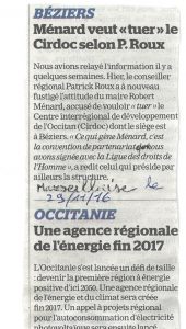 Midi-Libre, 8 novembre 2016 : « La Région s’inquiète de l’avenir du Cirdòc à Béziers »